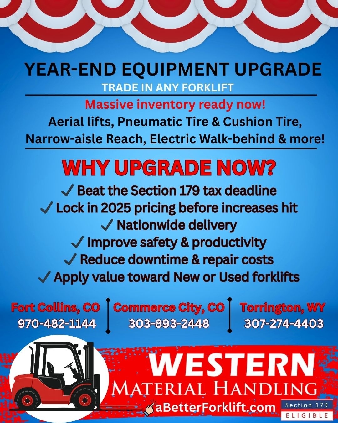 Right now, Western Material Handling is running a HUGE LIMITED-TIME YEAR-END SALE, and the pricing is honestly some of the best we’ve offered all year. Combined with Section 179 tax savings, it’s the perfect storm of timing, availability, and financial benefit. If you’ve been putting off buying a forklift, this window won’t last long.